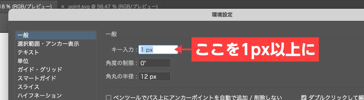 illustrator → 環境設定 → 一般 → キー入力 を「1px以上」に設定!
