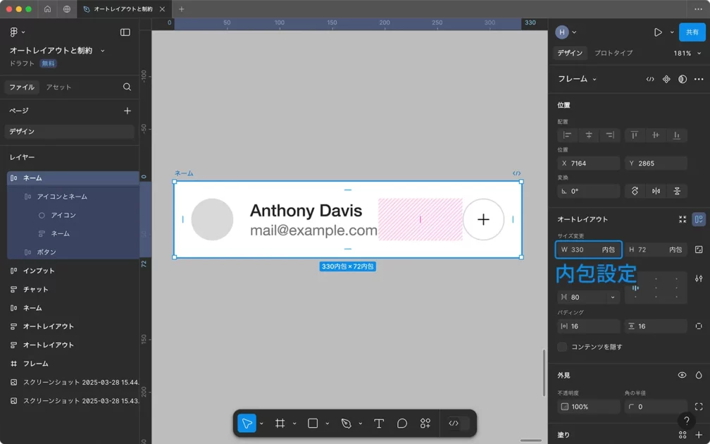 例えば、テキストが変動したり、要素の数が増減する場合、オートレイアウトを使うことでその変化に対応できます。要素の配置や間隔が自動的に調整されるので、レスポンシブデザインや柔軟なレイアウトに最適です。