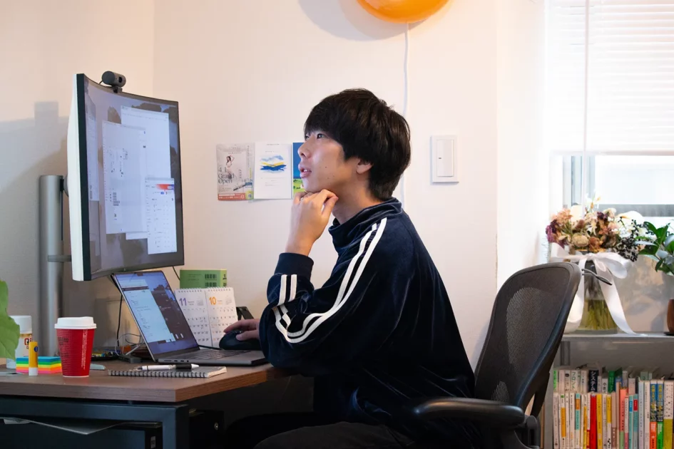 平日の 就業時間は10時〜19時で、 個人制作は主にその後の時間と土日を中心に行っています。
