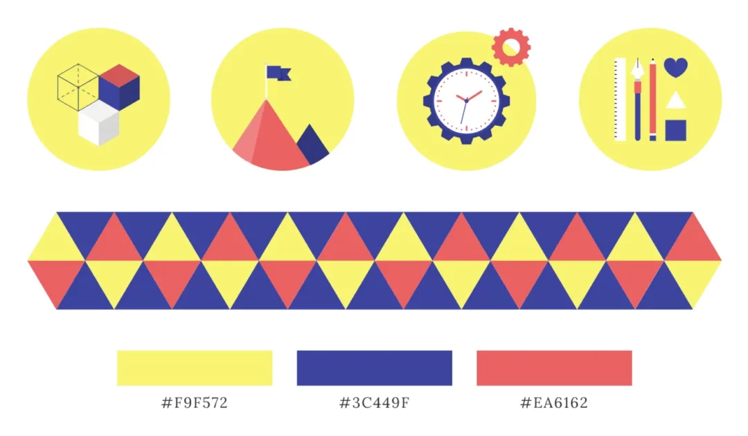 色相環上で均等に離れた3色を使う配色方法です。たとえば、赤、青、黄色のように、3つの色を組み合わせることでバランスが取れた、カラフルで活発な印象を作り出します。