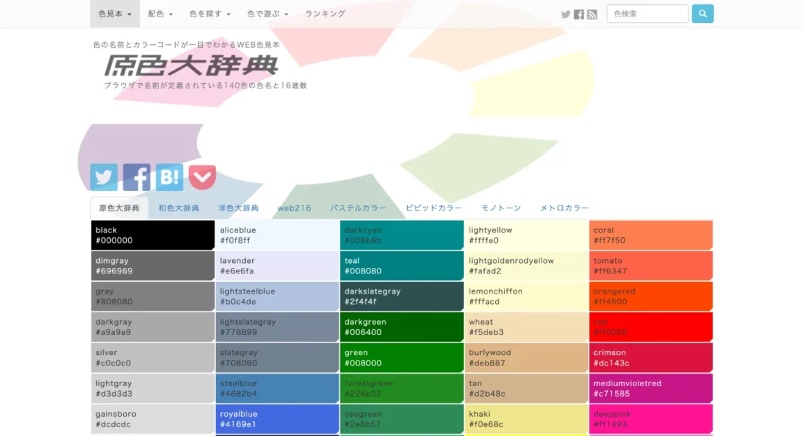 WEB色見本 原色大辞典は、色の名前とカラーコードを一目で確認できるWEB色見本サイトです。日本の伝統色や洋色、パステルカラー、ビビッドカラーなど、さまざまなカラーバリエーションを網羅しており、HTMLカラーコードも表示されます。
