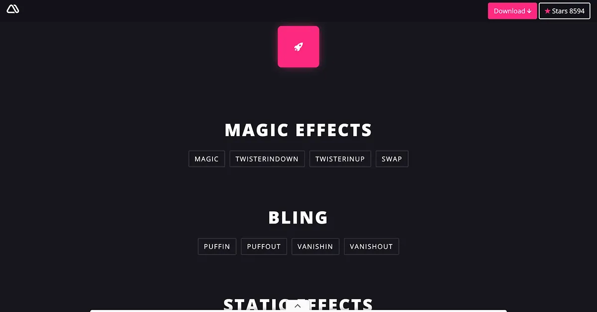 世界的に有名なCSSアニメーションライブラリで、膨大な数のプリセットが用意されています。