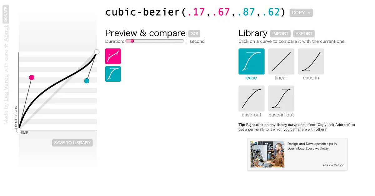 CSSのtransition-timing-functionで使用する「3次ベジェ曲線」を直感的に作成できるツールです。