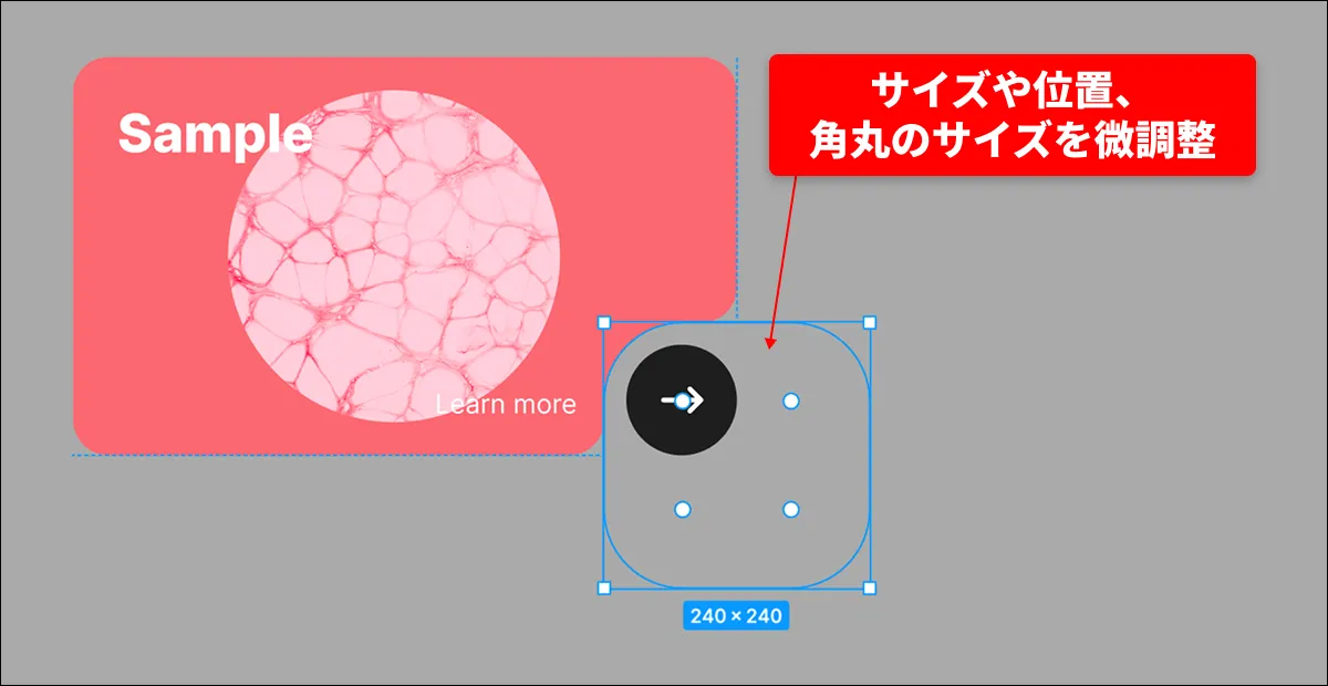 型抜きされた部分を確認しながら、サイズや位置、角丸のサイズを微調整します。