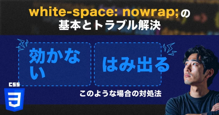 CSSのレイアウト調整でよく使われるプロパティのひとつが、white-space: nowrapです。 テキストを強制的に改行させず、横一列で表示できる便利な指定ですが、実際の使ってみると「文字がはみ出る」「効かない」「 … 続きを読む 【white-space: nowrap】の基本とトラブル解決|効かない・はみ出る場合の対処法