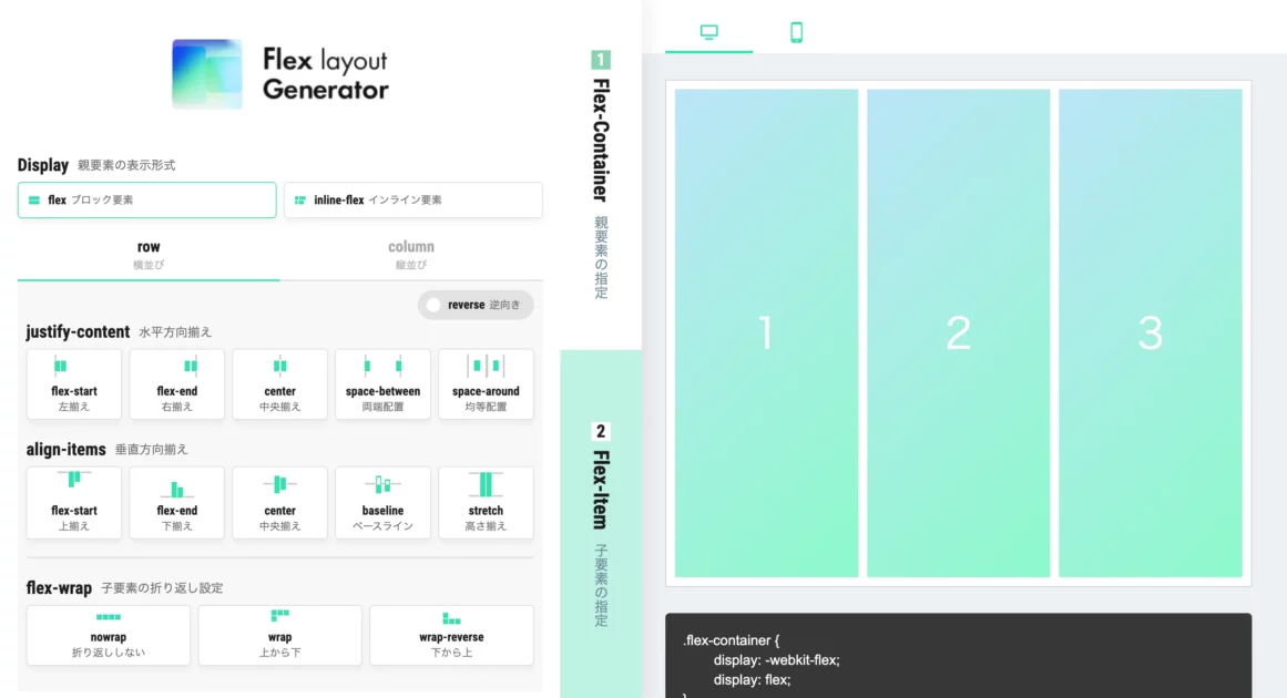 Flex Layout Generator は、より詳細なFlexbox設計に適したツールです。複数のコンテナや要素の配置を視覚的に確認しながらコーディングできるため、効率的なレイアウト作成が可能です。