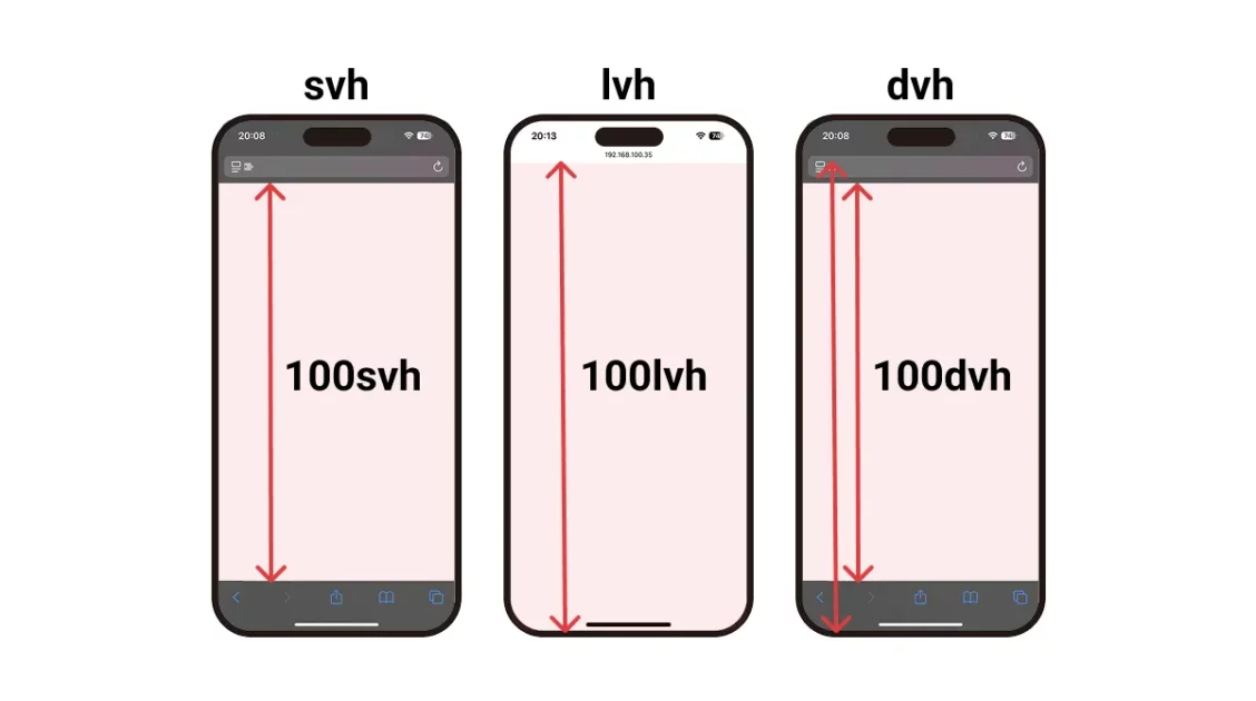 - dvh (Dynamic):最も柔軟で、UIの有無に応じてサイズが変化します。