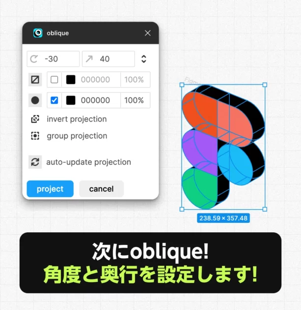 続いて、変形したオブジェクトに「oblique」で奥行き(立体感)を付けます。