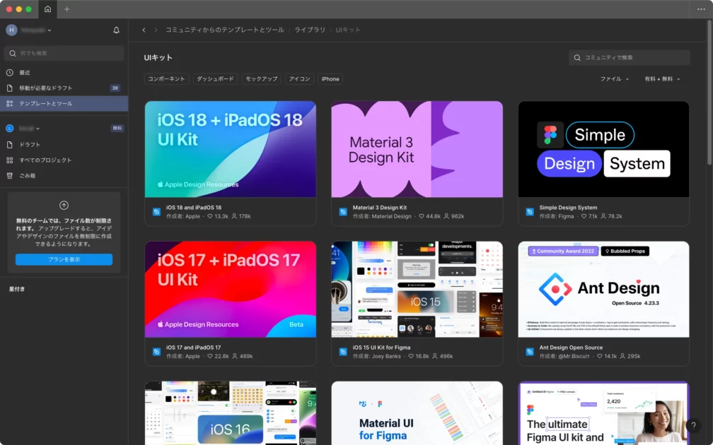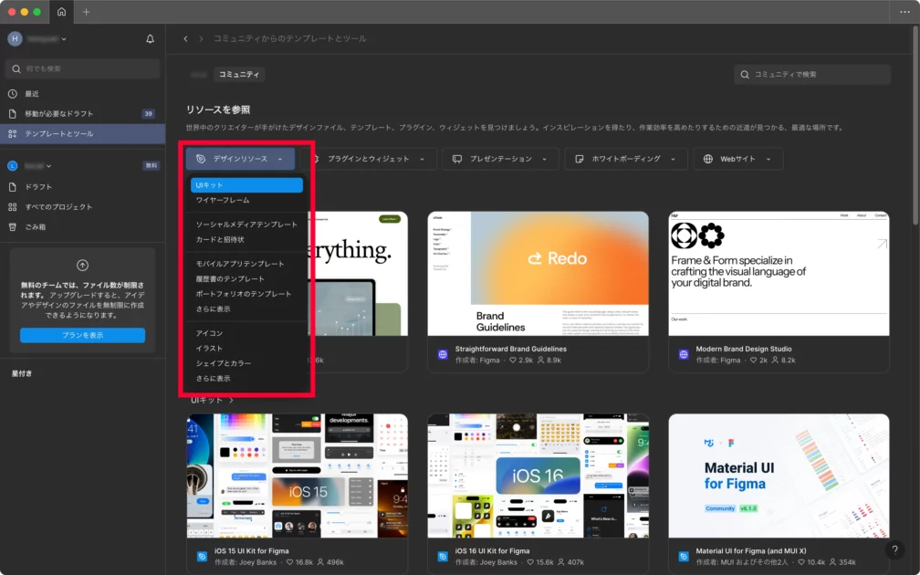 世界中のデザイナーがUIキット、プラグイン、アイコン素材などを共有しており、