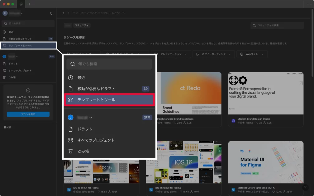 Figmaを開き、左サイドバーにある「テンプレートとツール」をクリックすると、