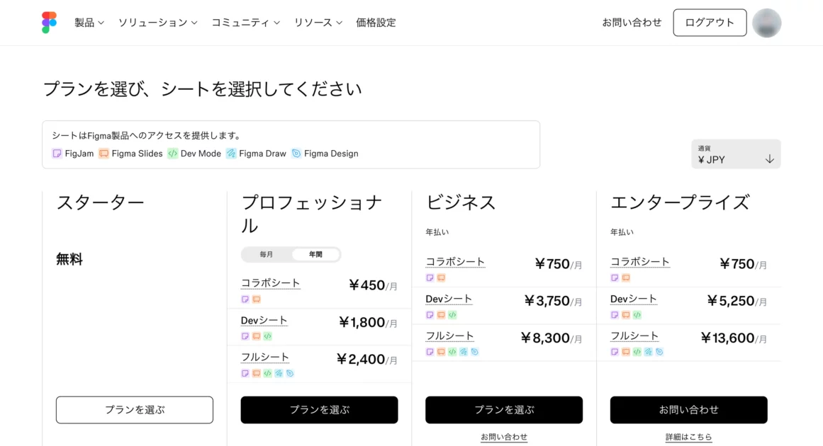 Figmaのプランは、大きく分けてスターター、プロフェッショナル、ビジネス、エンタープライズの4つが存在します。