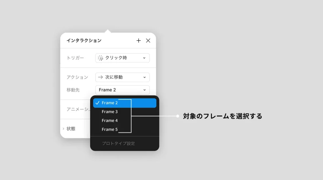 右側の「プロトタイプ」タブを開くと、ボタンや画像などの要素から矢印を引いて、遷移先の画面(フレーム)を直感的に設定できるようになります。