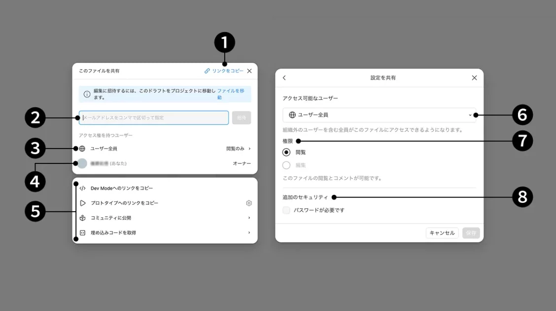 これには、開発者モード、プロトタイプ、コミュニティ公開、埋め込み、およびFigJam専用のオプションが含まれます。 - ユーザー全員 (アクセス設定)