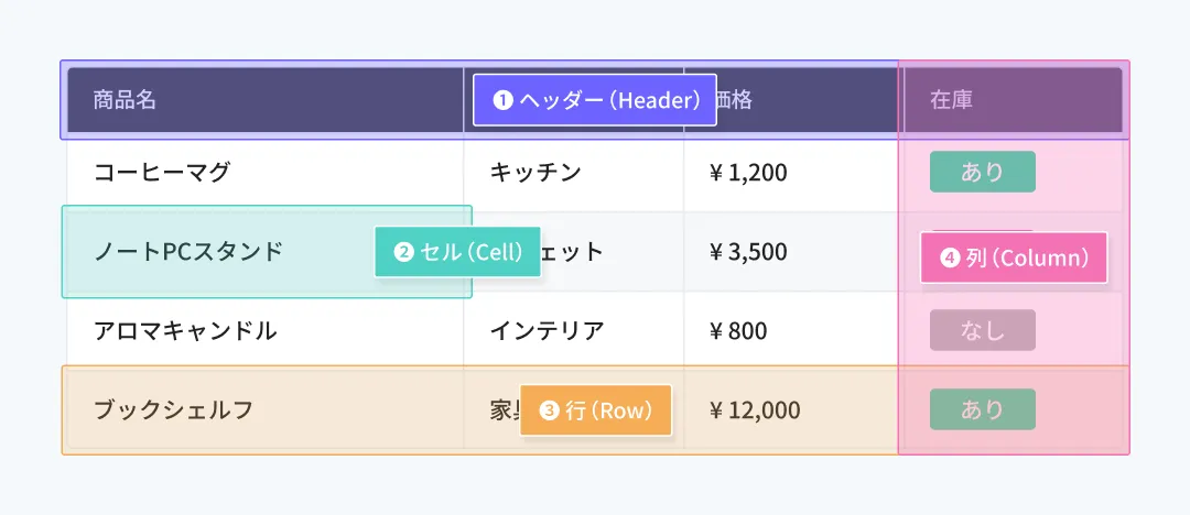 ユーザーにどの情報がどの列に入っているかを示すため、見やすく整えることが大切です。 - セル(Cell)