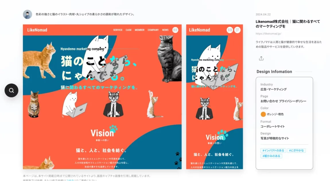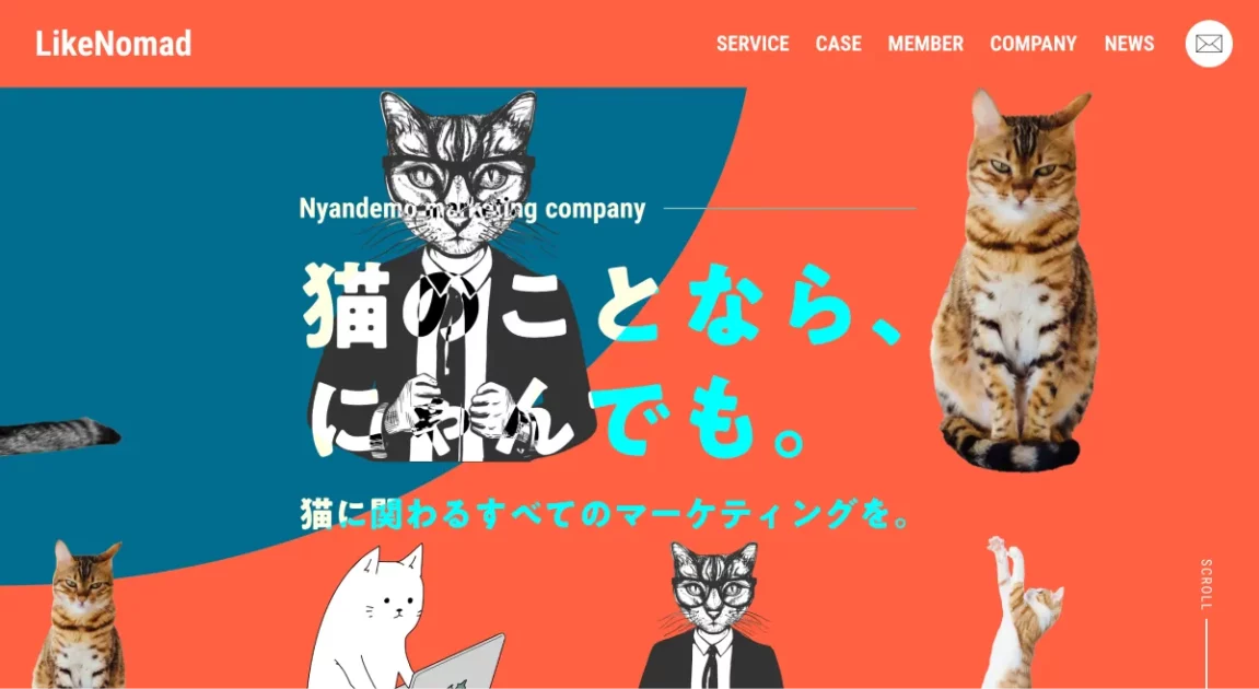 「猫に関わるすべてのマーケティングを。」とある通り様々な猫の表現方法があり、フォントを含め角丸を意識したキャッチーなサイトです🐈