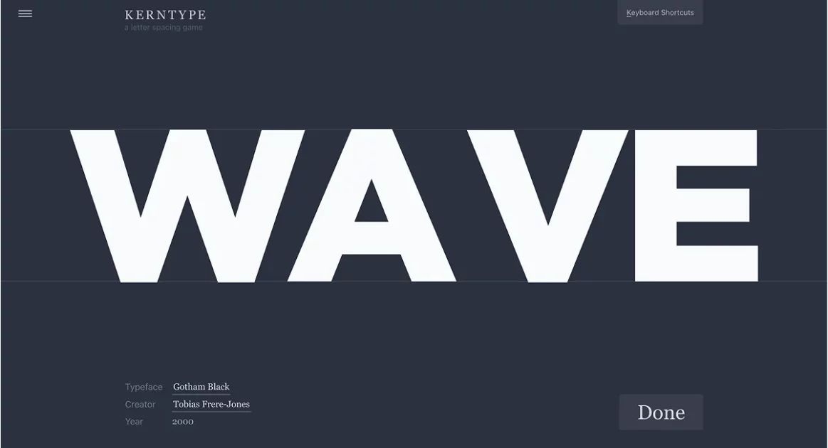 指定された文字をドラッグして、見た目が自然に見える位置に調整し、完了したら 「Done」をクリックすると採点されます。