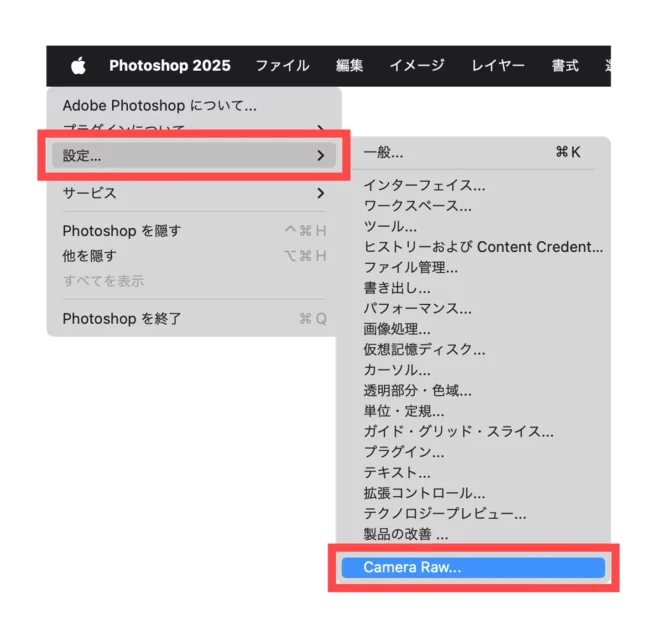 メニューから「Photoshop > 設定 > Camera Raw...」を選択します。