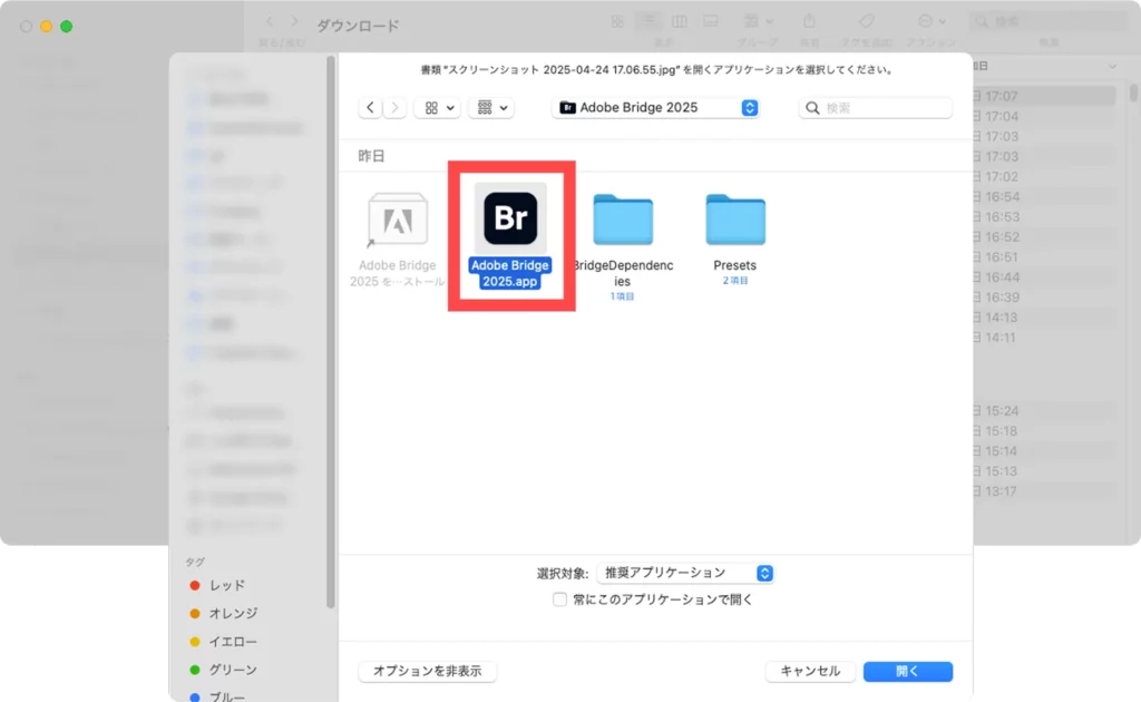 Finderから画像を選択し、右クリックメニューから「このアプリケーションで開く > その他 > Adobe Bridge」を選択します。