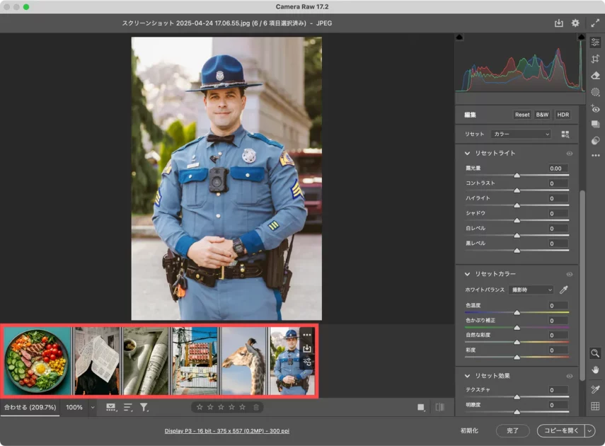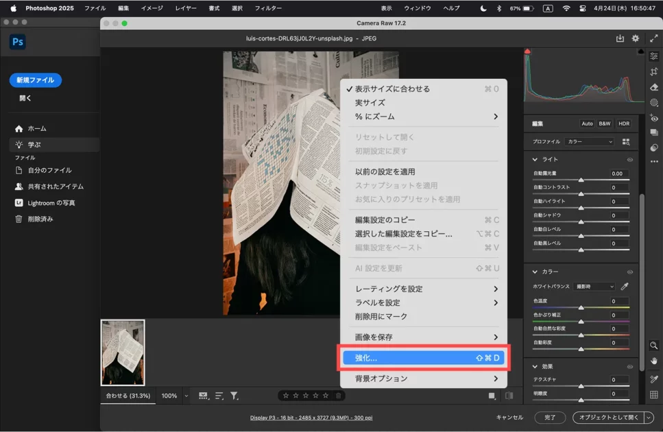 先ほどの設定で自動的にCamera Rawが起動します。画像にカーソルを合わせて右クリック → 「強化」を選択(または Shift + Cmd + D)
