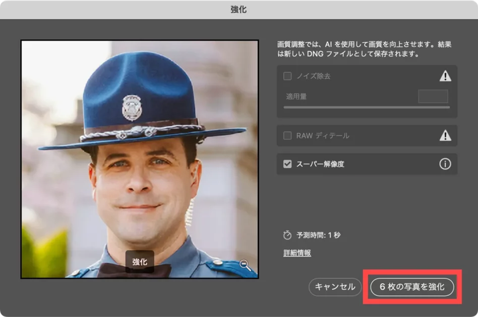 「スーパー解像度」にチェックを入れると解像度が強化されたプレビューが表示されるので、確認後「強化」ボタンをクリック。