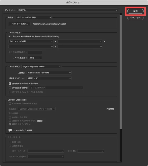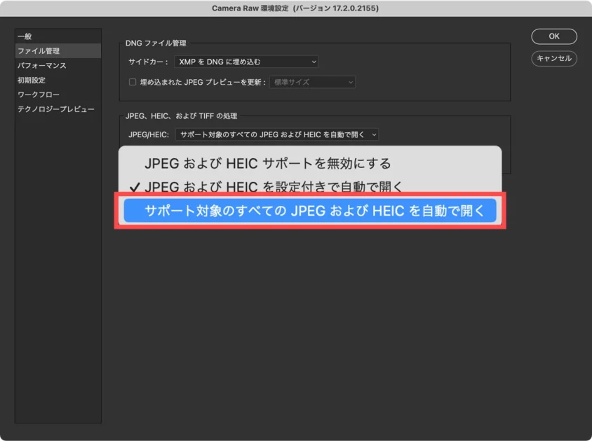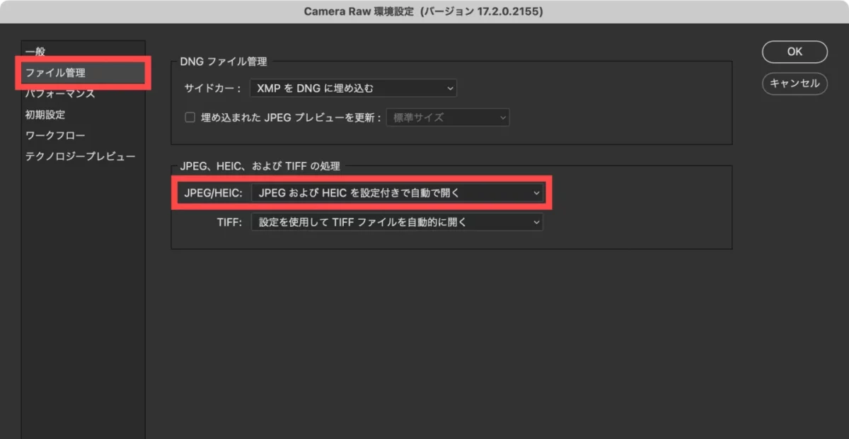 この設定により、JPEGやHEICでもCamera Rawで開かれるようになり、スーパー解像度を適用できるようになります。
