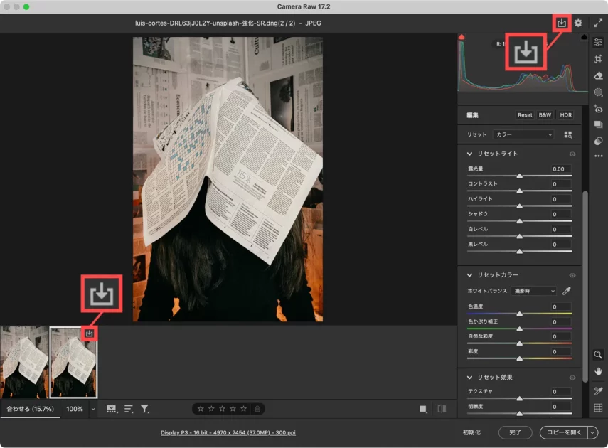 強化された画像は、左下サムネイルまたは右上の保存アイコンから、保存することができる。