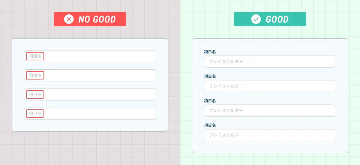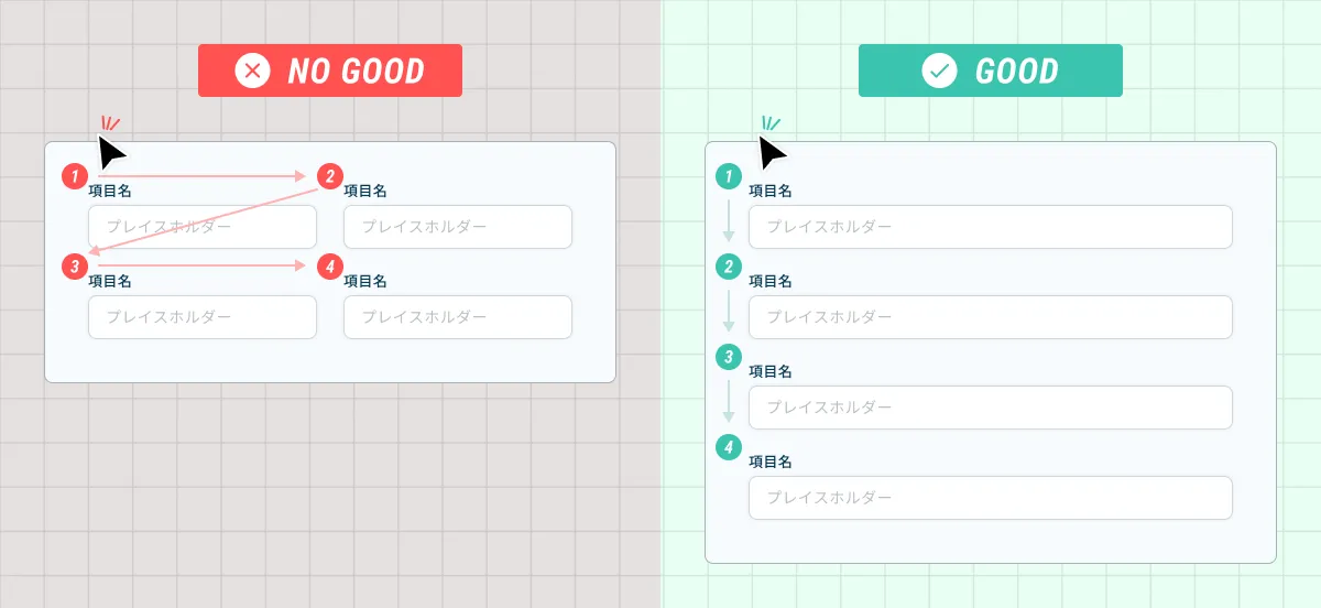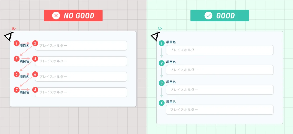 ※ 例外として「姓」と「名」のように慣例的に横並びが期待される項目や、管理画面などで大量のデータを一度に確認する必要がある場合は、横並びも許容されます。