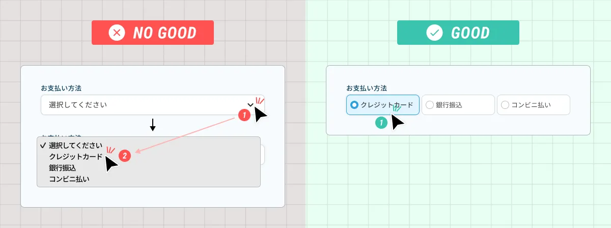ドロップダウンメニューは選択肢を隠してしまうため、2回以上のクリックを強います。