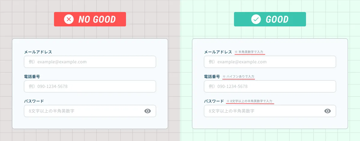 迷いやすいポイントには補足テキスト(ヘルプテキスト)を添え、入力前に条件を伝えましょう。