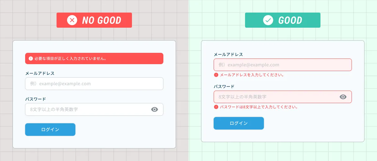 エラー内容は、ページ上部にまとめて表示するのではなく、該当する入力欄のすぐそばにインラインで表示しましょう。どこを修正すべきか直感的に理解できるようになります。