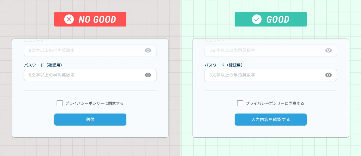 「送信」といった抽象的な表現よりも、「会員登録を完了する」「この内容で予約する」など、ボタンを押した後のアクションを明確に示す言葉を選びましょう。