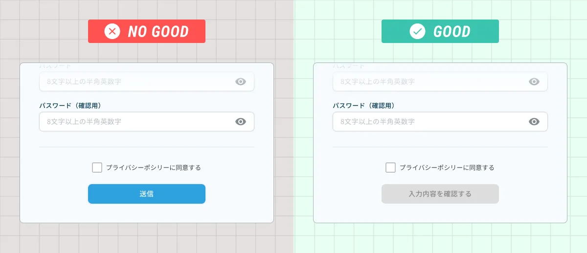 また、必須項目の未入力や規約への未同意がある場合は、ボタンをDisabled(無効状態)にしておきましょう。次にすべき操作をユーザーに伝え、エラーの発生を未然に防ぐことができます。
