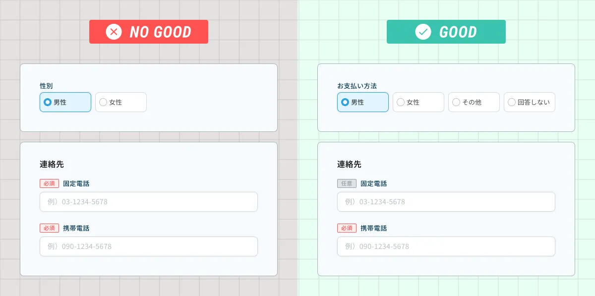 例えば、性別を「男性・女性」の2択に限定したり、固定電話の入力を必須にしたりすることは、多様なライフスタイルに合わず、ブランドイメージを損なう恐れがあります。