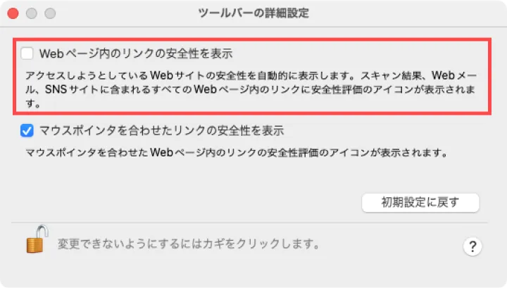 Web脅威対策の詳細設定から「Webページ内のリンクの安全性を表示」のチェックボックスを外すことで、リンクに対する安全性評価のアイコンが非表示になります。