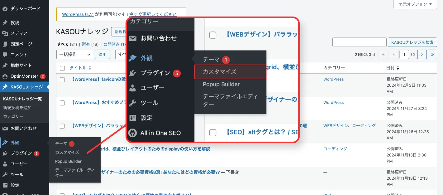WordPressの管理画面にアクセスします。 - カスタマイズメニューを開く