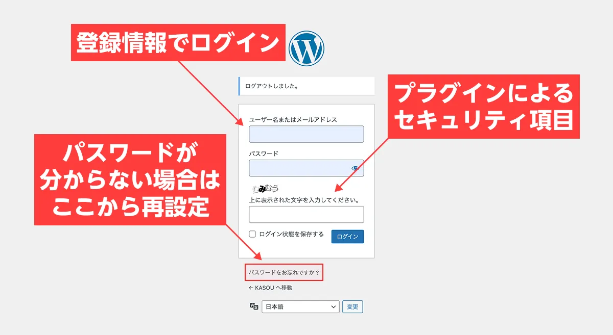 このURLでログインできない場合、プラグイン「Login rebuilder」などでログイン画面のURLが意図的に変更されている可能性があります。