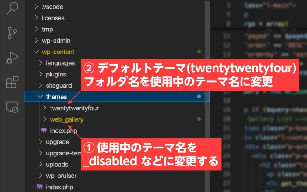 - 現在のテーマフォルダを テーマ名_disabledに変更し、