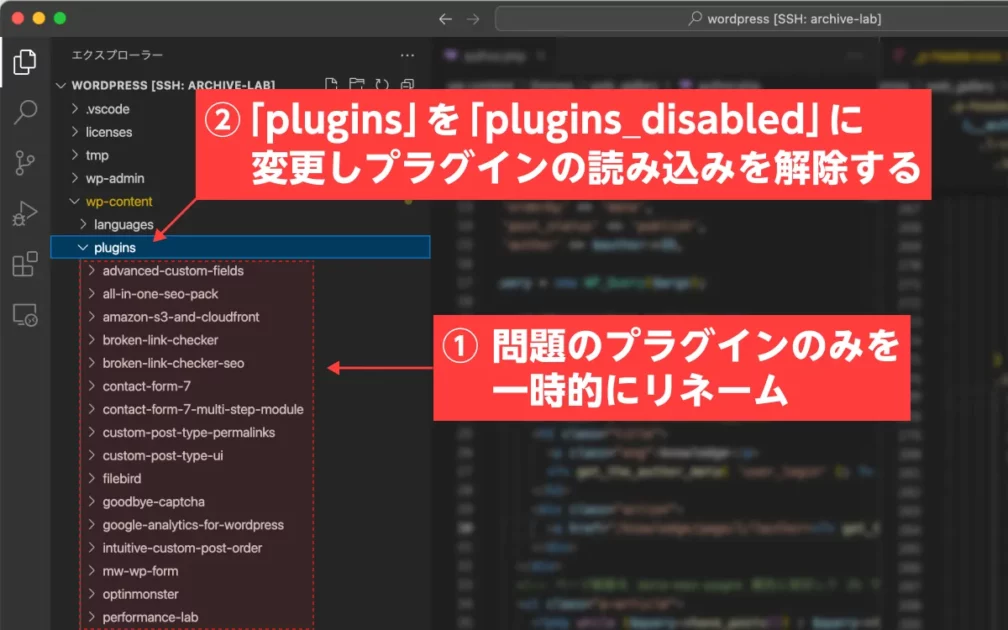- FTPでwp-content/plugins/フォルダを開き、問題のプラグインを一時的にリネームする