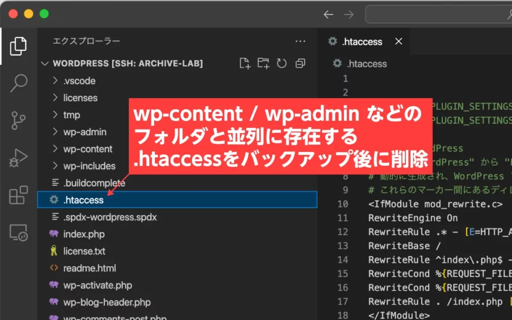 - .htaccessファイルが壊れているか、誤った設定が含まれている
