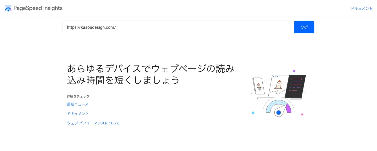 Google PageSpeed Insightsにアクセスし、解析したいWebページのURLを入力します。 - 分析開始