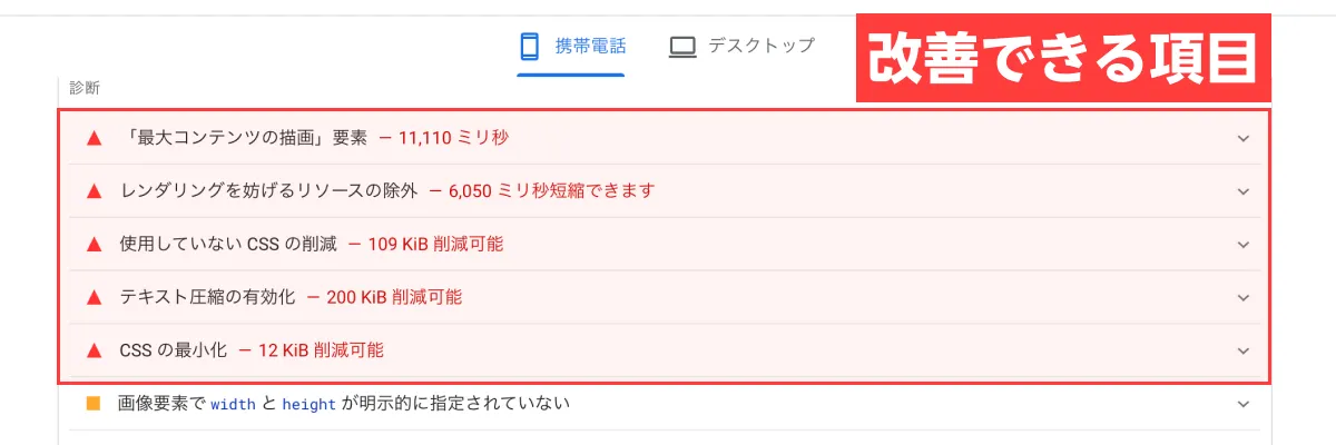 スコア(0〜100)とともに、パフォーマンス向上のための具体的な改善点が表示されます。