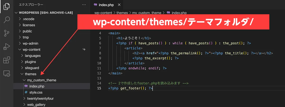 my-custom-themeフォルダを wp-content/themes/ にアップロード。 - WordPress管理画面の「外観」→「テーマ」からアップロードしたテーマを有効化。