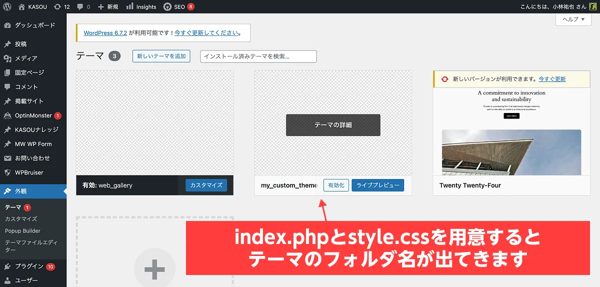 - 「外観」→「テーマ」から「My Custom Theme」を有効化。