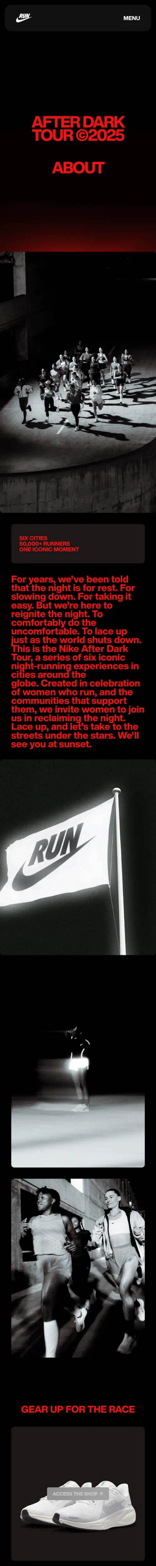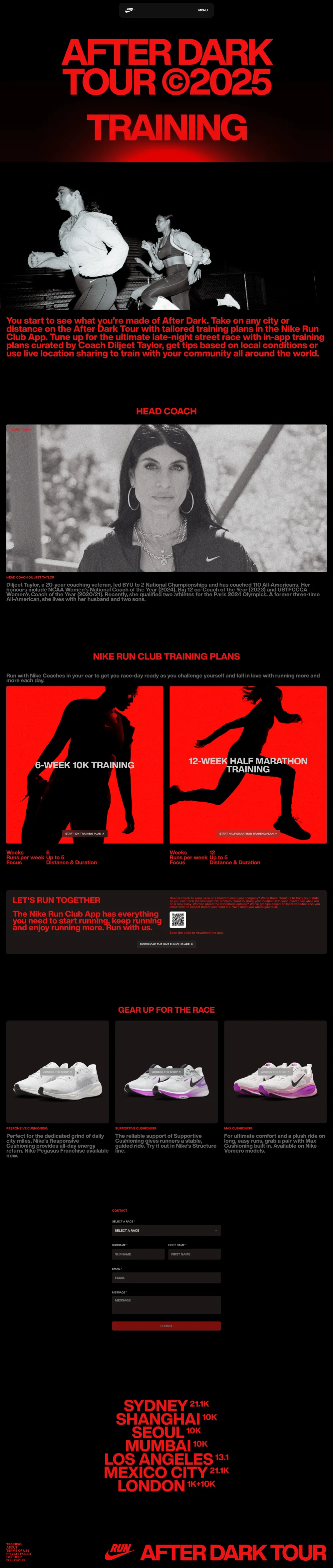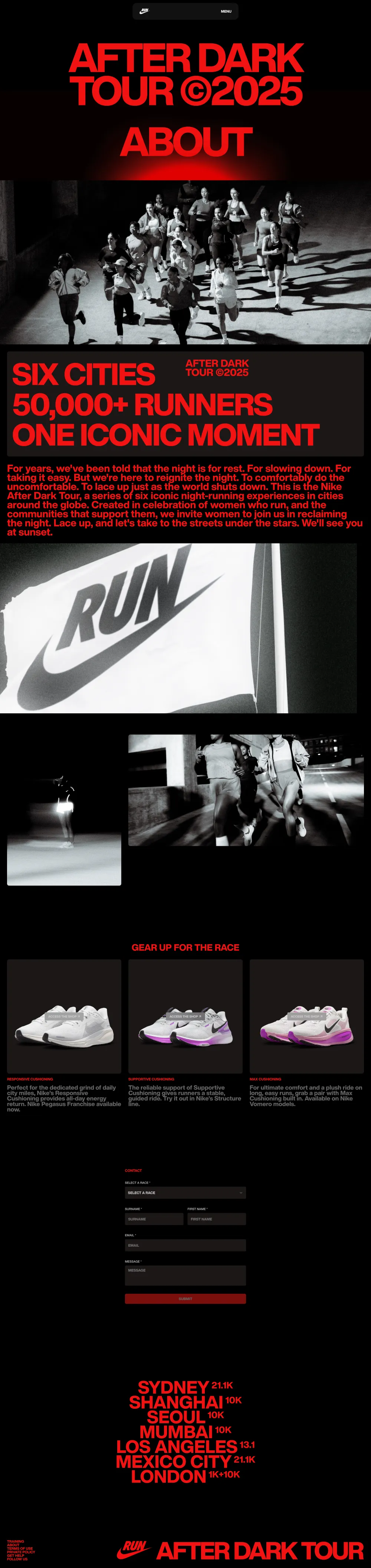 https://afterdarktour.nike.com/en/homeAs a continuation of Nike's mission to invite more women into sport, the brand is announcing the 2025 After Dark Tour, a global women's race series designed to be the ultimate girls' weekend. This unique series of nighttime running events is crafted to bring female runners together, fostering a sense of community, self-expression and belief that will leave athletes feeling seen, supported and motivated to take on their next challenge.