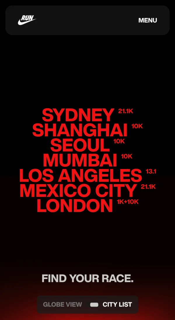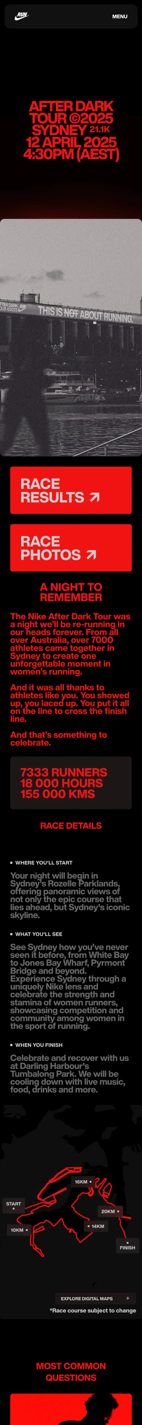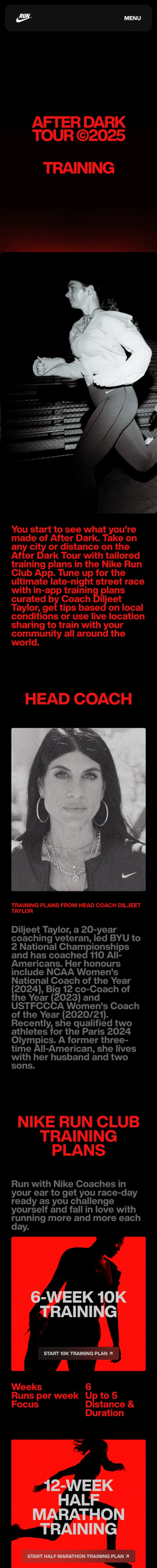 https://afterdarktour.nike.com/en/homeAs a continuation of Nike's mission to invite more women into sport, the brand is announcing the 2025 After Dark Tour, a global women's race series designed to be the ultimate girls' weekend. This unique series of nighttime running events is crafted to bring female runners together, fostering a sense of community, self-expression and belief that will leave athletes feeling seen, supported and motivated to take on their next challenge.