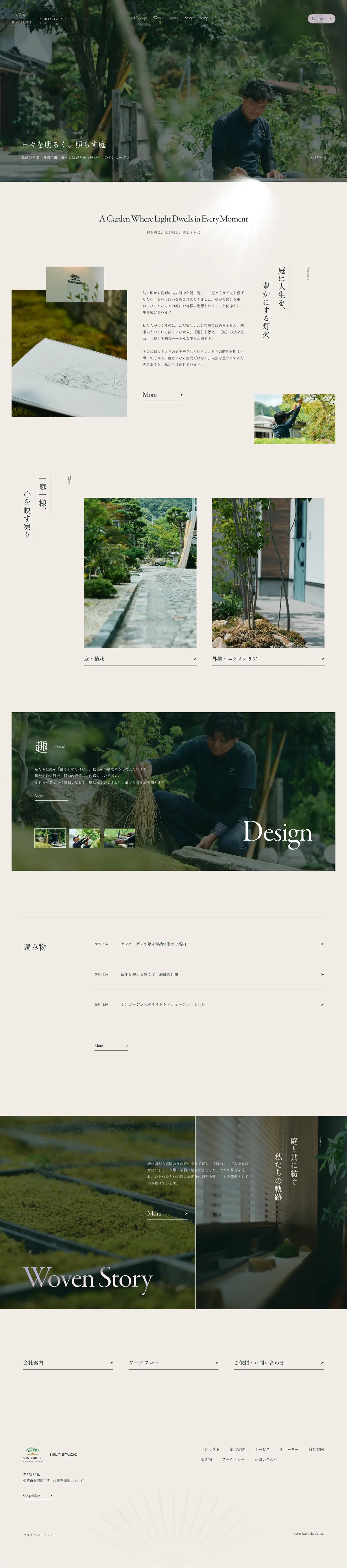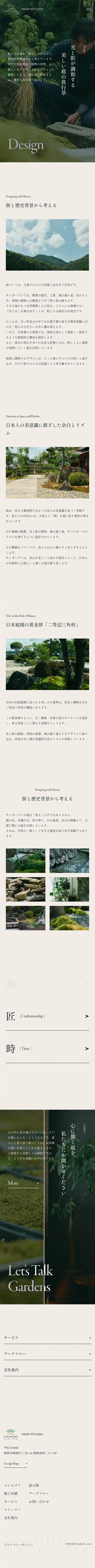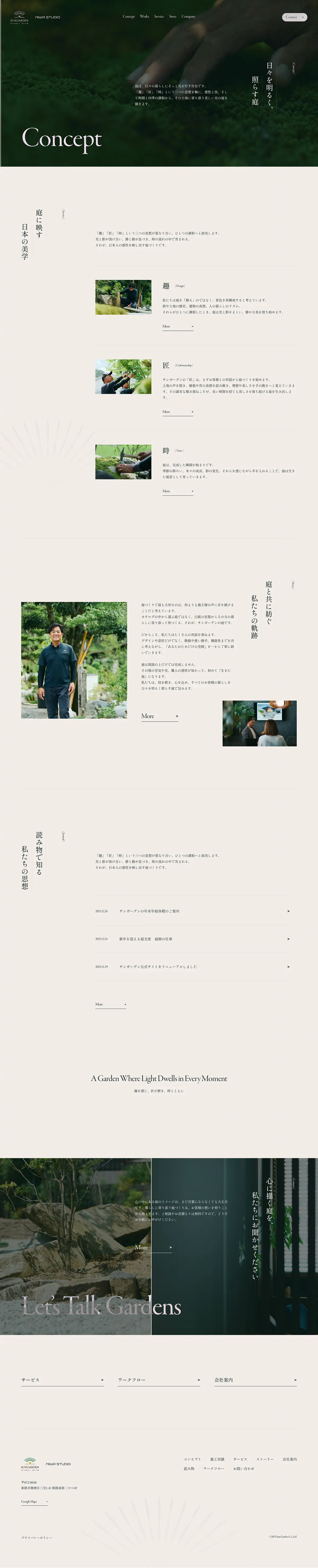 余白を活かした静謐なレイアウトと、暗めの画像が織りなす重厚感が、庭師の「職人気質」をうまく表現されています🪴