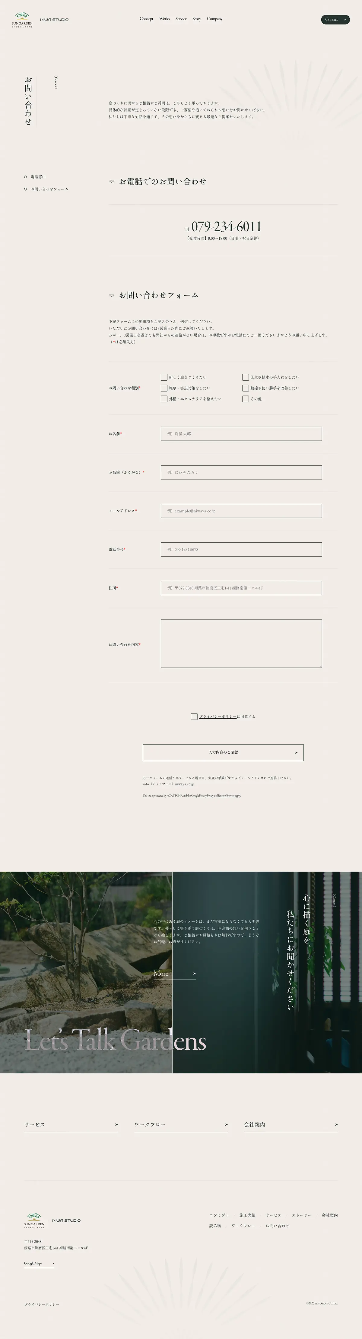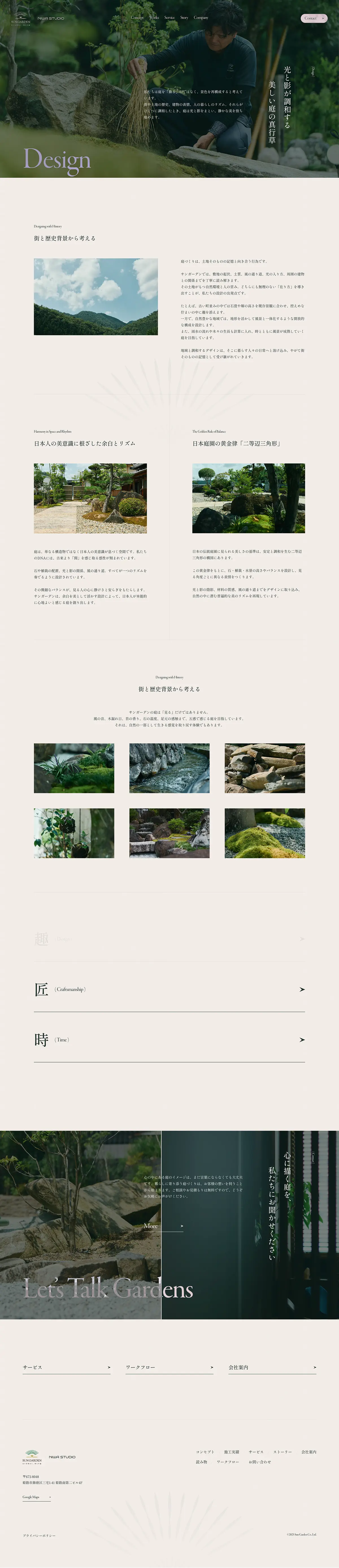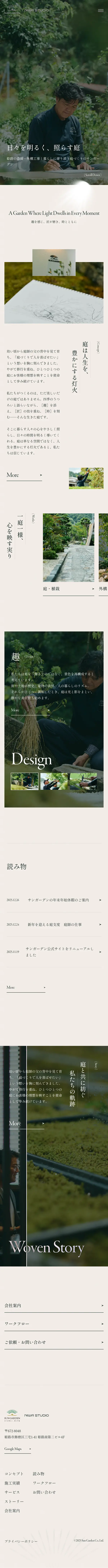 余白を活かした静謐なレイアウトと、暗めの画像が織りなす重厚感が、庭師の「職人気質」をうまく表現されています🪴