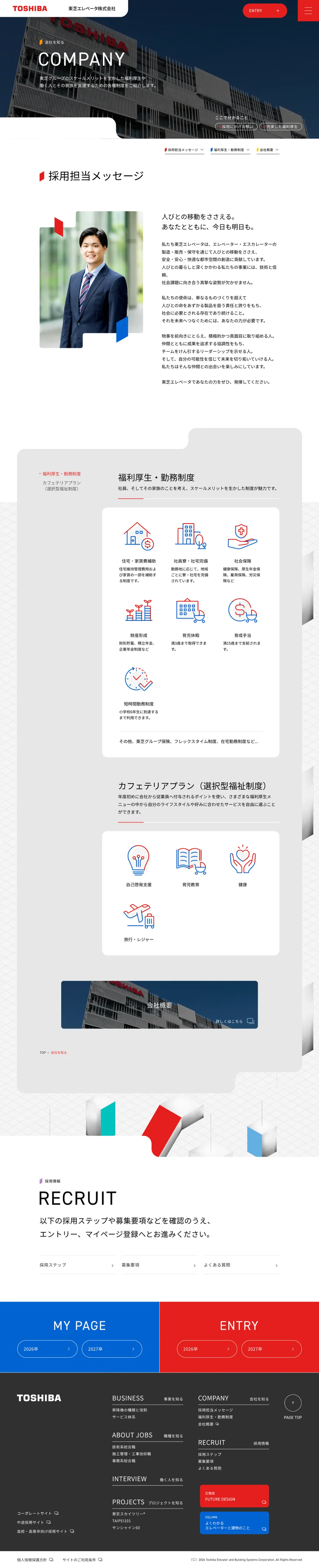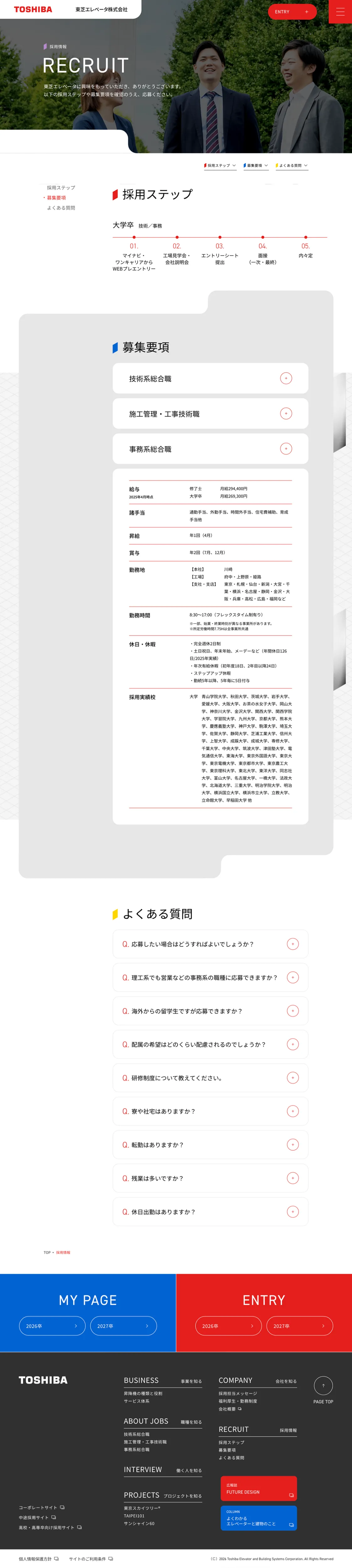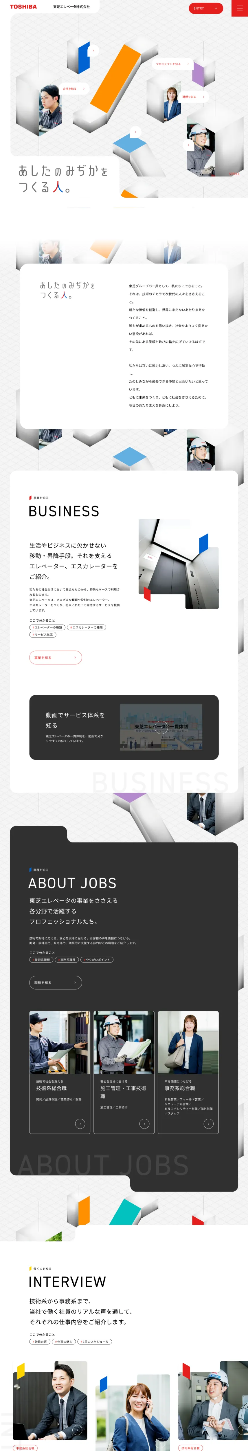 https://www.toshiba-elevator.co.jp/elv/recruit/shinsotsu/東芝エレベータの新卒採用サイトです。エレベーターやエスカレーターの設計・製造・据付・保守など、幅広い仕事を紹介するとともに、社員インタビューや福利厚生、エントリーに関する情報も掲載しています。
