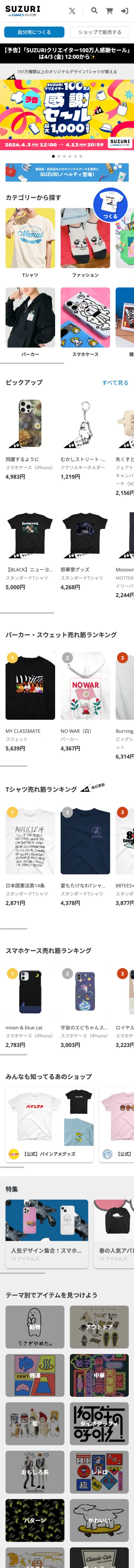 https://suzuri.jp/オリジナルグッズ・アイテムの作成・販売ならSUZURI(スズリ)。販売点数1990万点以上、会員数150万人、登録クリエイター数70万人突破。動画クリエイターやYouTuberのファングッズ制作に最適!自分だけのTシャツやスマホケースなどを簡単につくることができます。