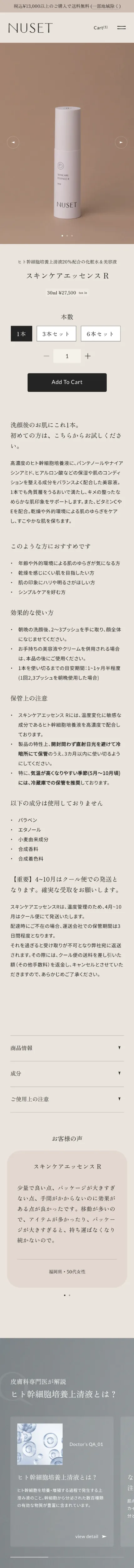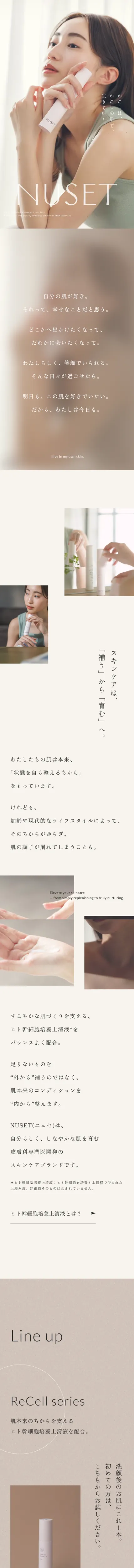 https://nuset.jp/NUSET(ニュセ)は、自分らしく、しなやかな肌を育む 皮膚科専門医開発のスキンケアブランドです。わたしたちの肌は本来、「状態を自ら整えるちから」をもっています。けれども、加齢や現代的なライフスタイルによって、 そのちからがゆらぎ、肌の調子が崩れてしまうことも。すこやかな肌づくりを支える、 ヒト幹細胞培養上清液をバランスよく配合。足りないものを“外から”補うのではなく、 肌本来のコンディションを“内から”整えます。